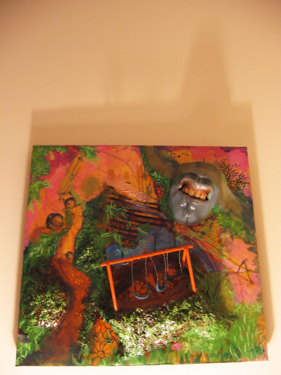 Him Merging Future, mixed media, polymer clay, fabric on panel, 15" x 15" x 5", 2006