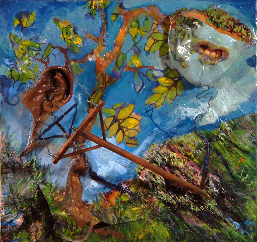 Sir Facing Past, mixed media, polymer clay, fabric on panel, 15" x 15" x 5", 2006